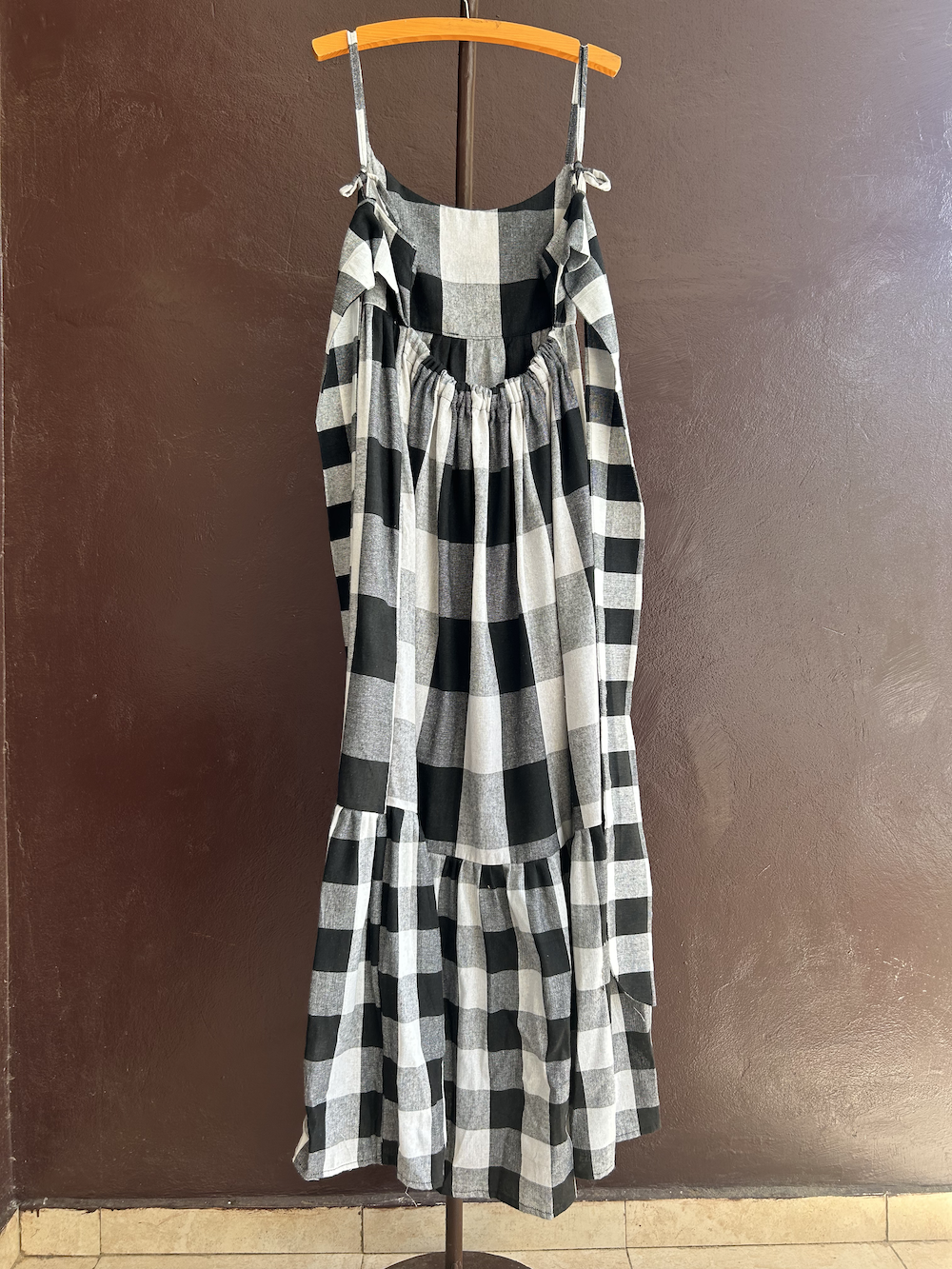 A long dress made from checked Vichy fabric.