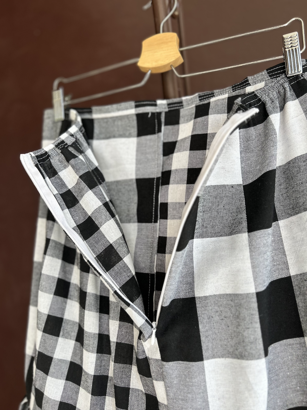 黒白チェック(大)(中)の2つの生地をクロスするように組み合わせた、大胆だけどエレガントな印象が魅力。