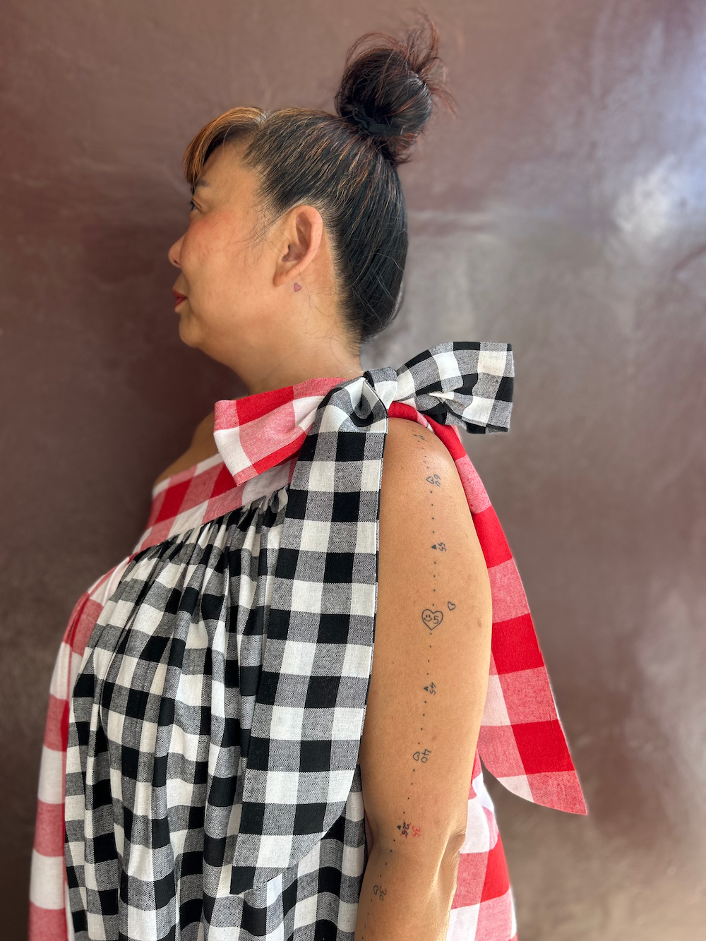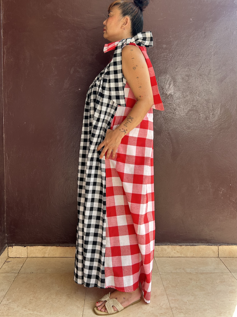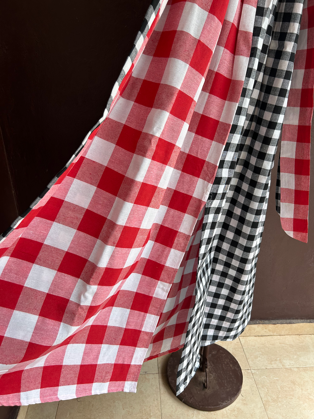 赤白チェック(大)と黒白チェック(中)を交互に組み合わせた、大胆だけどエレガントな印象が魅力。