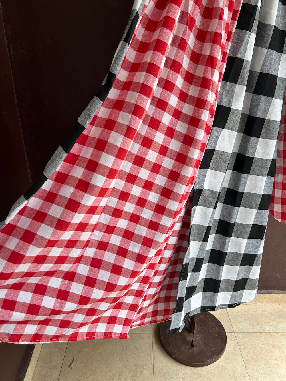 黒白チェック(大)と赤白チェック(中)を交互に組み合わせた、大胆だけどエレガントな印象が魅力。