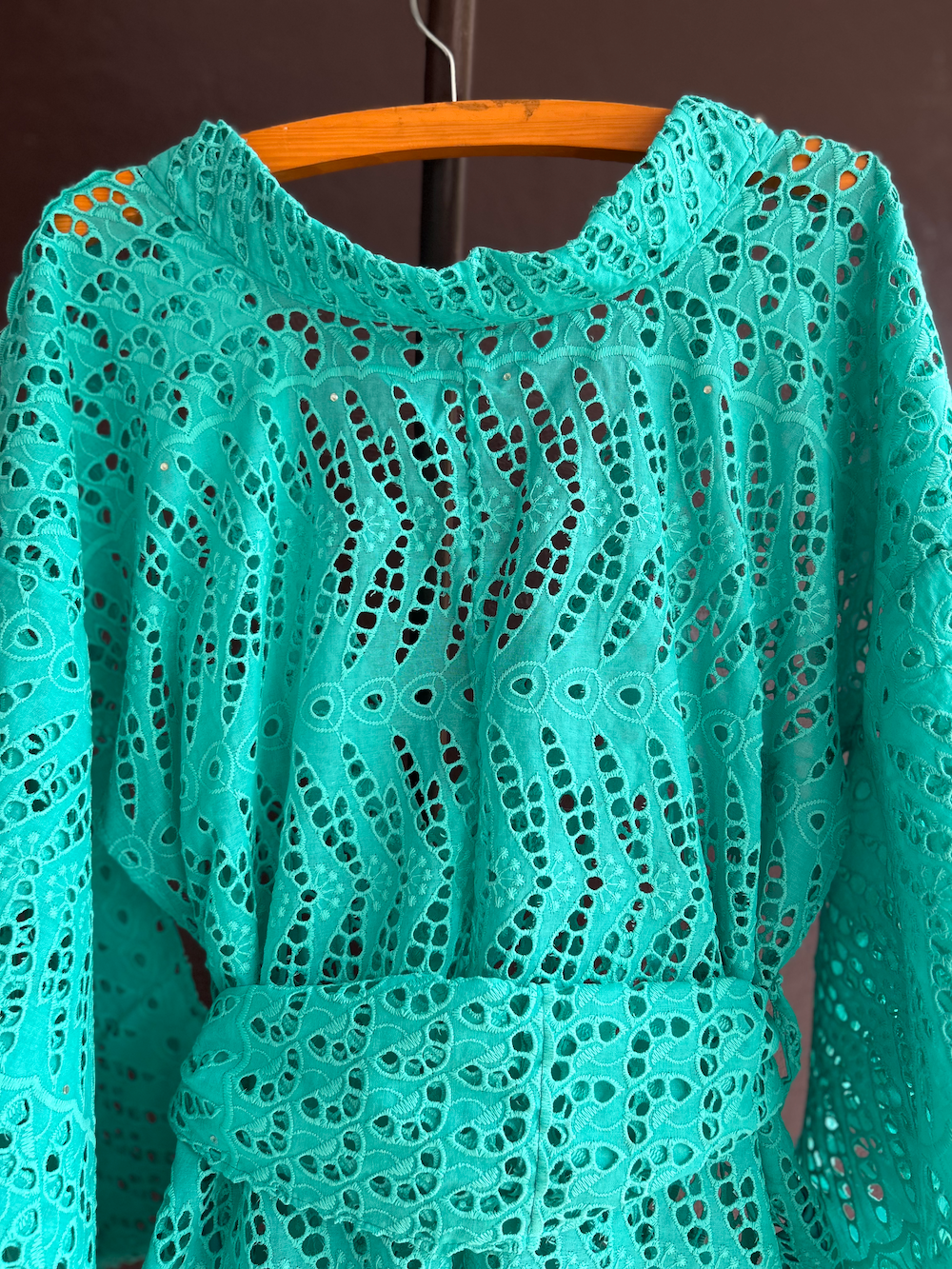 通気性にも優れ、レースの隙間から、木漏れ日のようにやさしく肌を透かすブロディレース。纏う人の性別を問わず、ナチュラルに美しさと色気が引き立つ一着です。