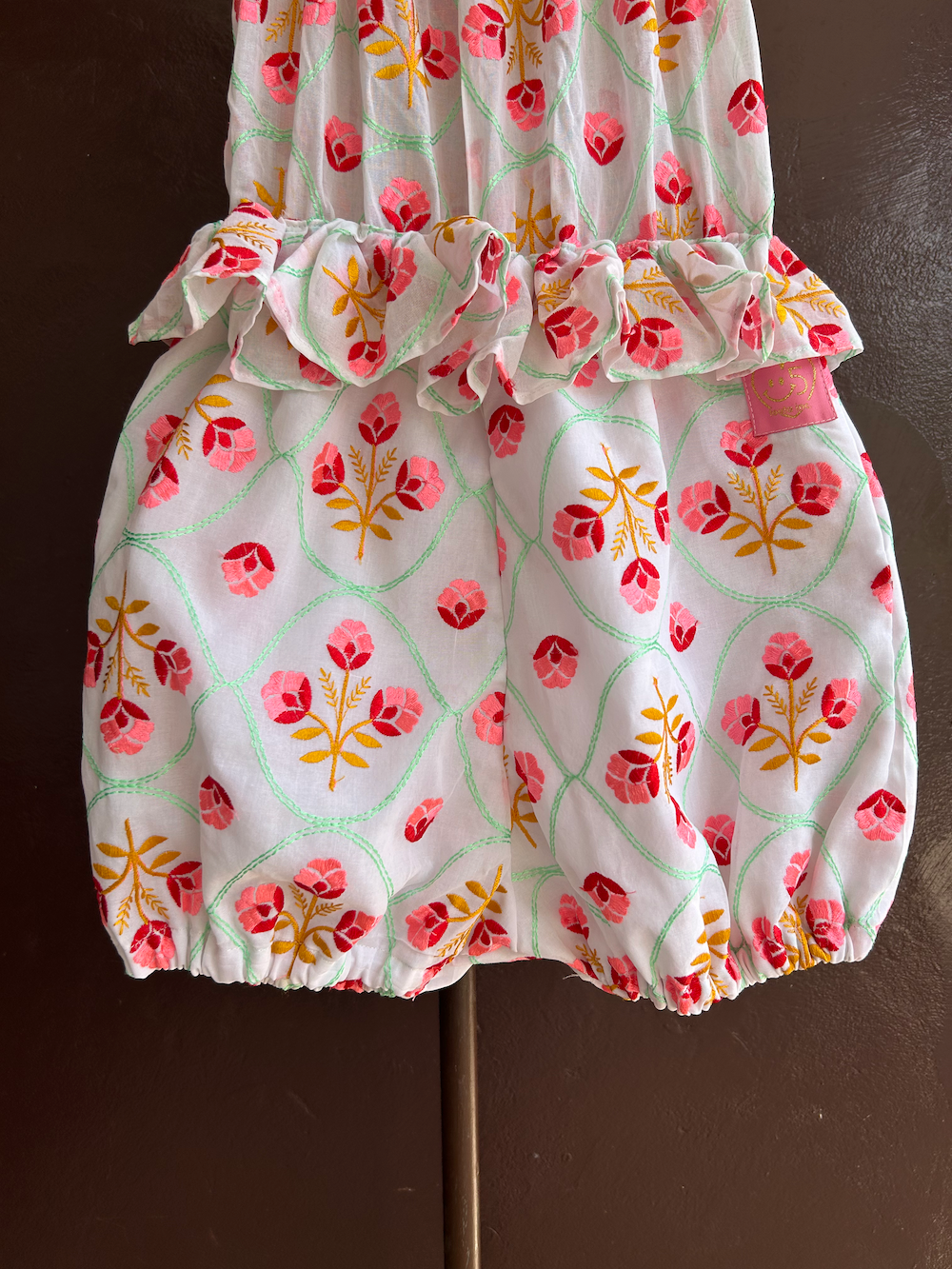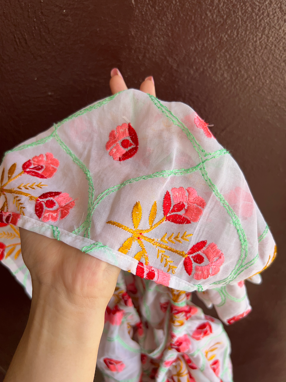 白地に繊細なピンクの刺繍が施された生地は、