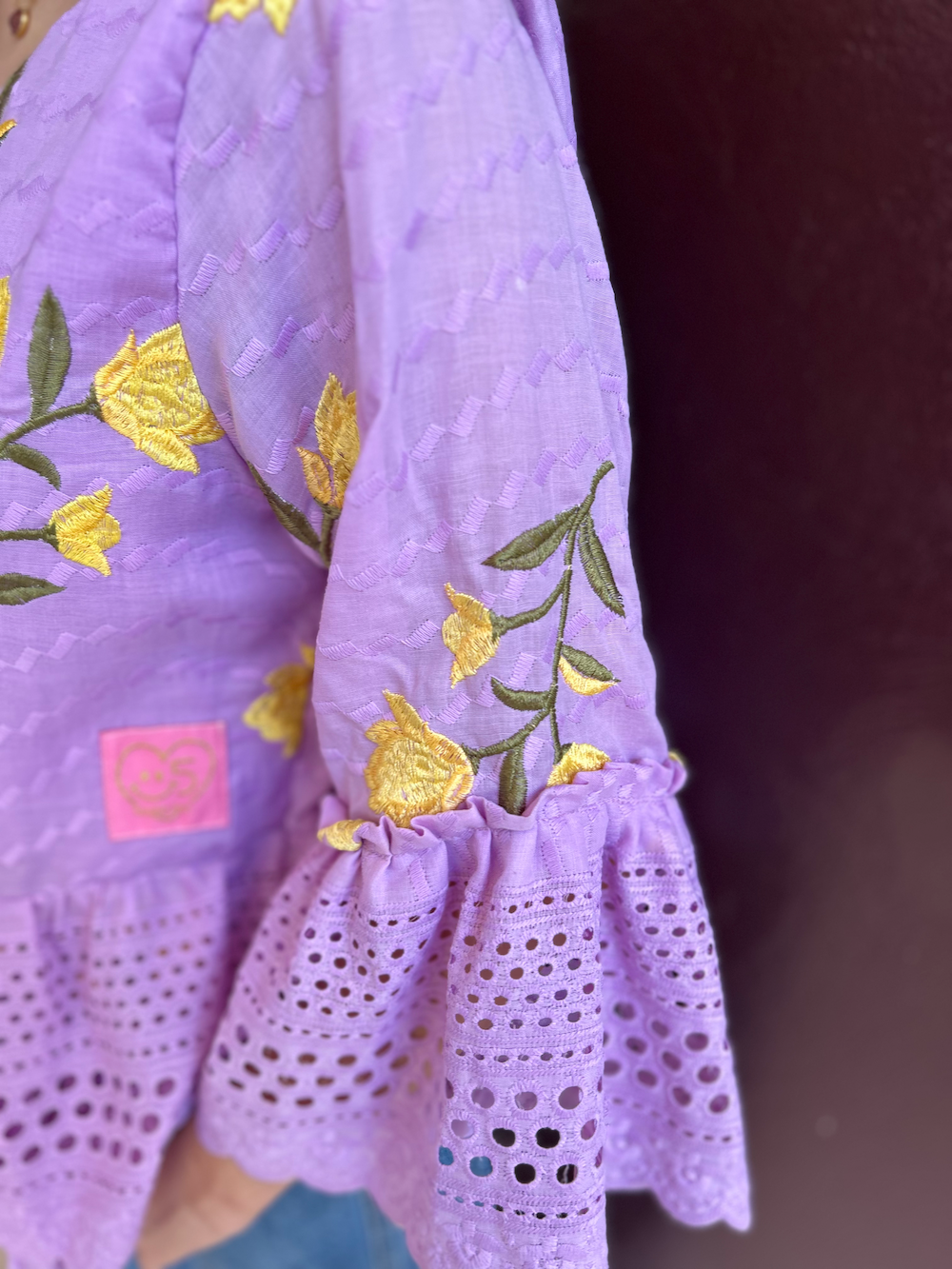 袖とボディ裾にたっぷりとレースフリルをあしらい、