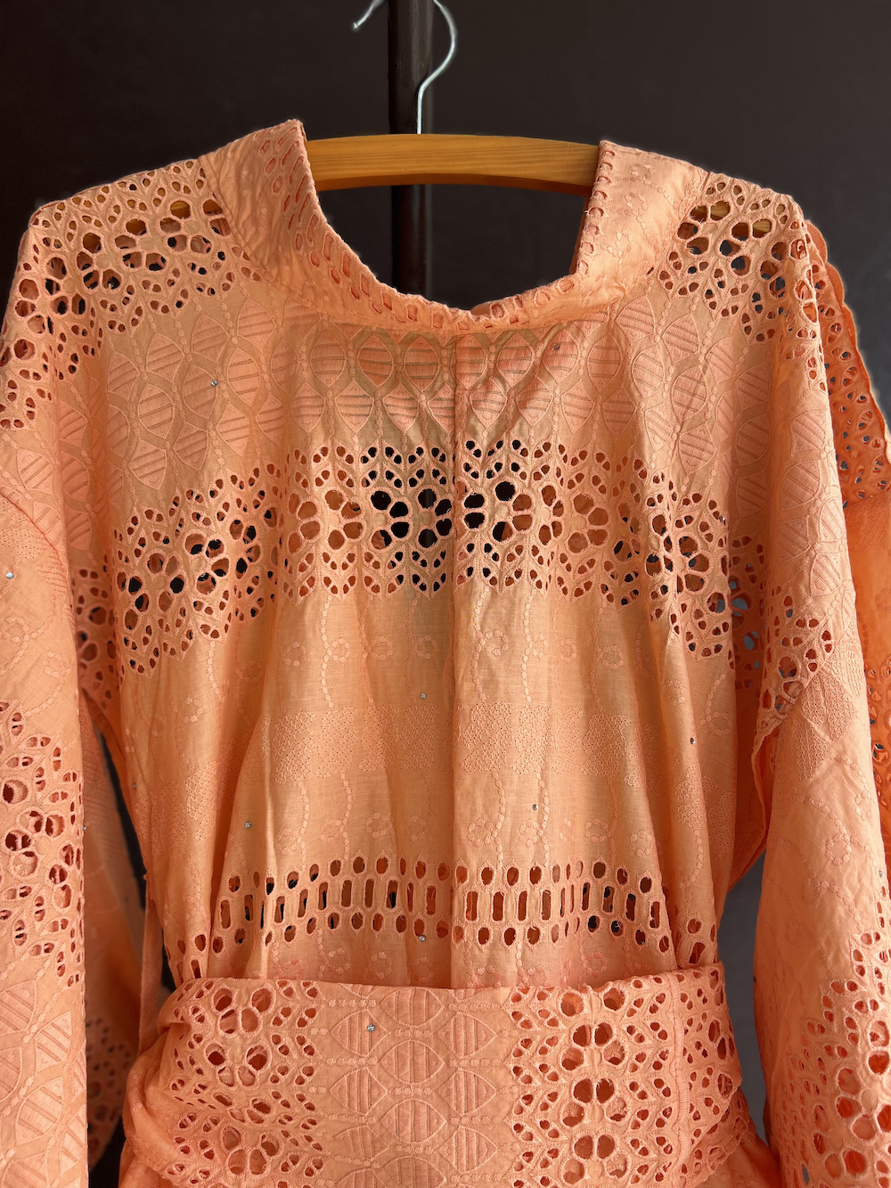 通気性にも優れ、レースの隙間から、木漏れ日のようにやさしく肌を透かすブロディレース。纏う人の性別を問わず、ナチュラルに美しさと色気が引き立つ一着です。